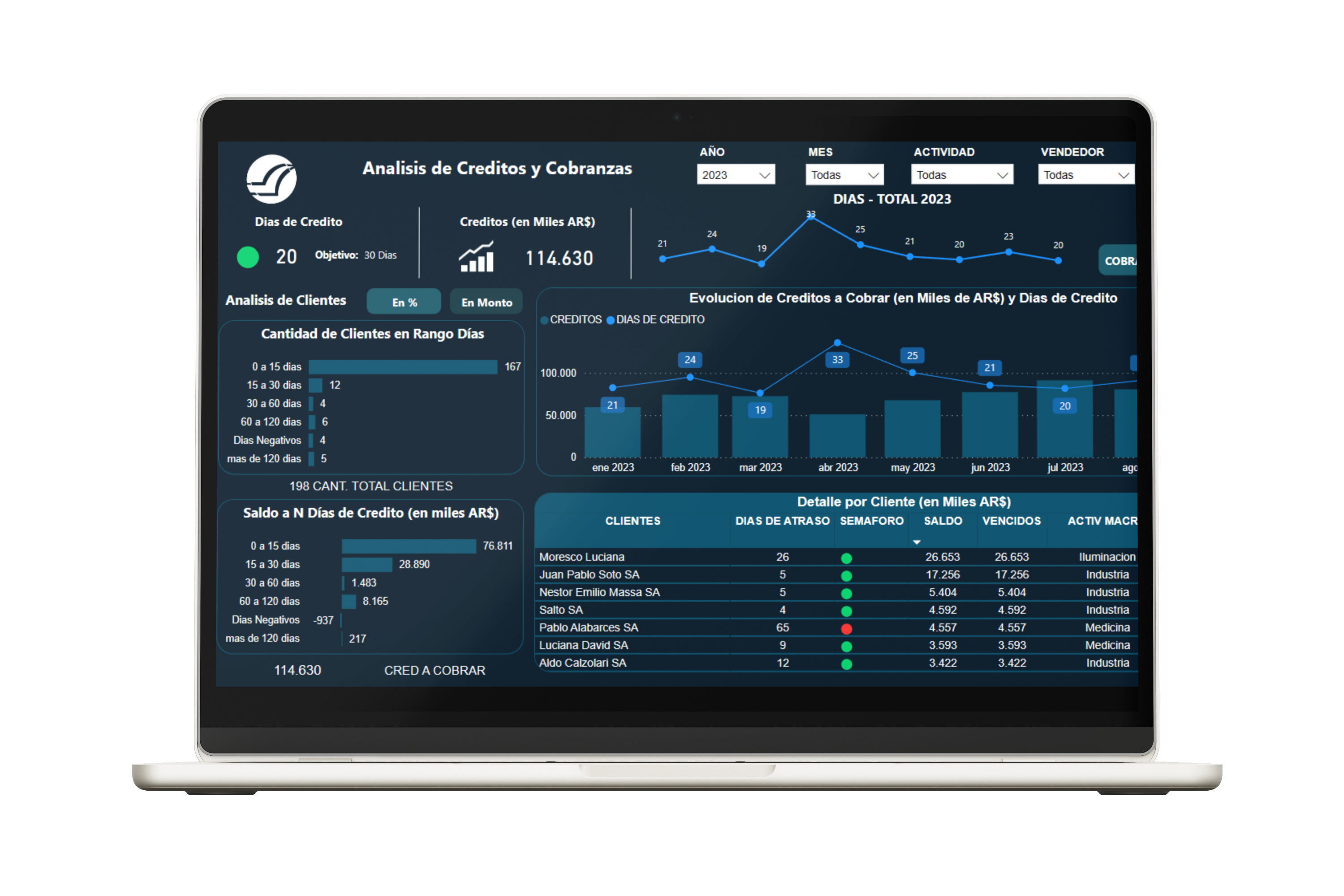 - Visualizá los plazos y montos de tus créditos y cobranzas abiertos por industria, cliente y vendedor