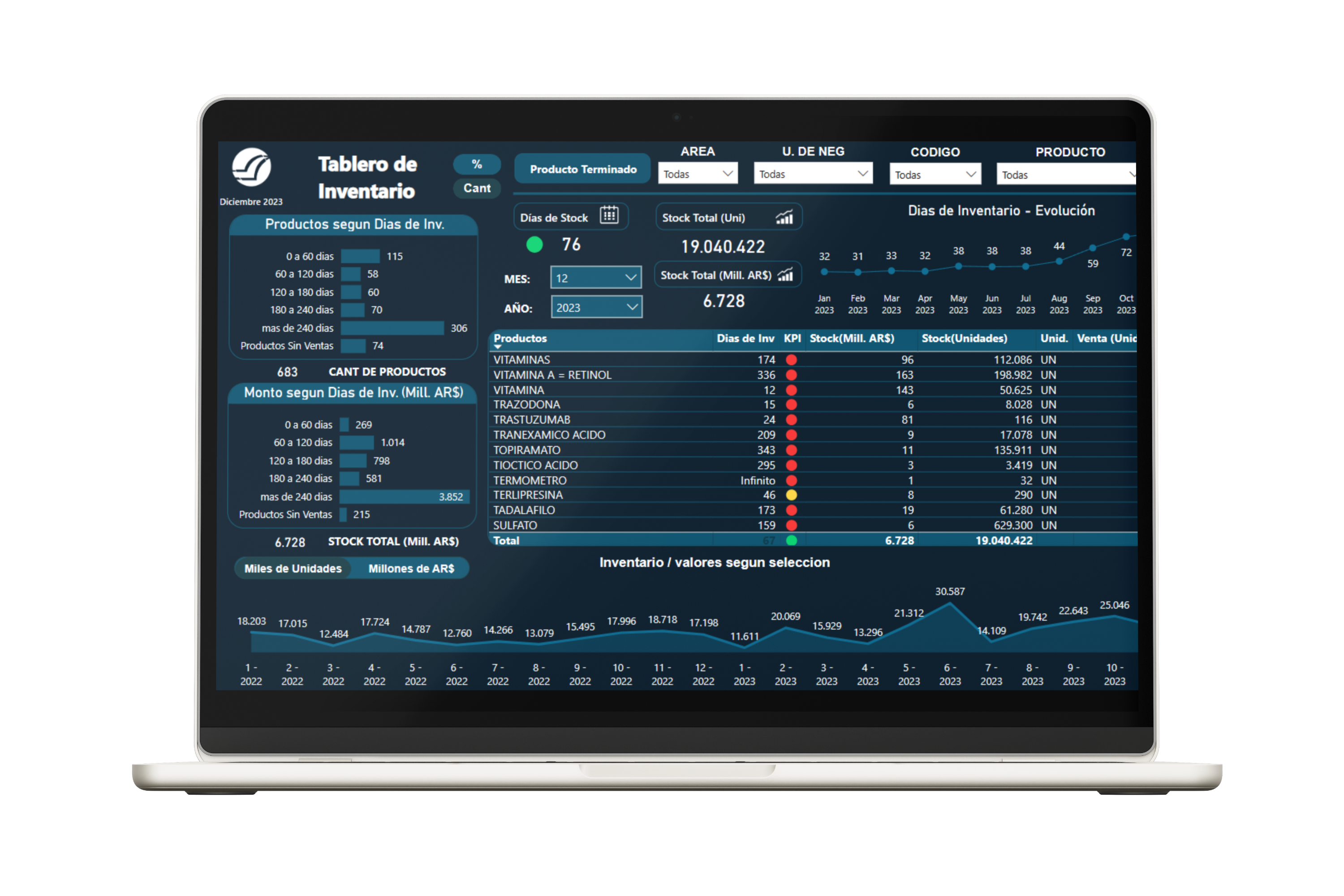 - Seguí la evolución de los días de inventario para los diferentes productos y proveedores